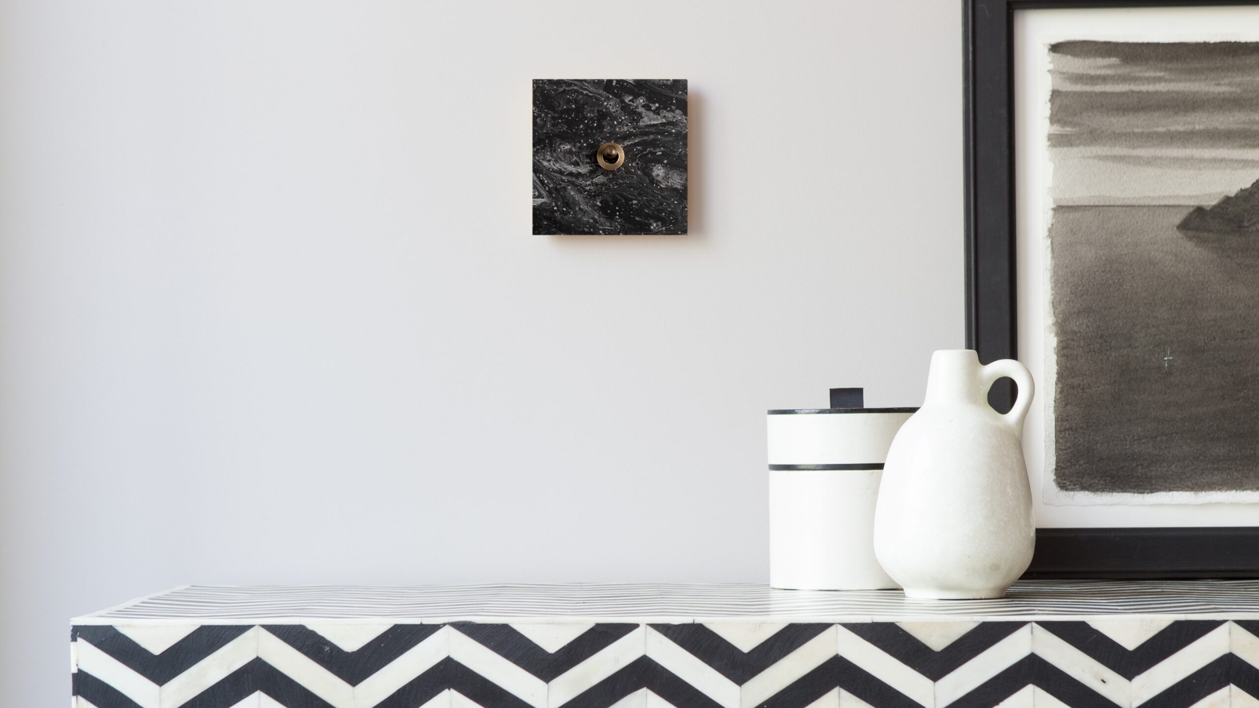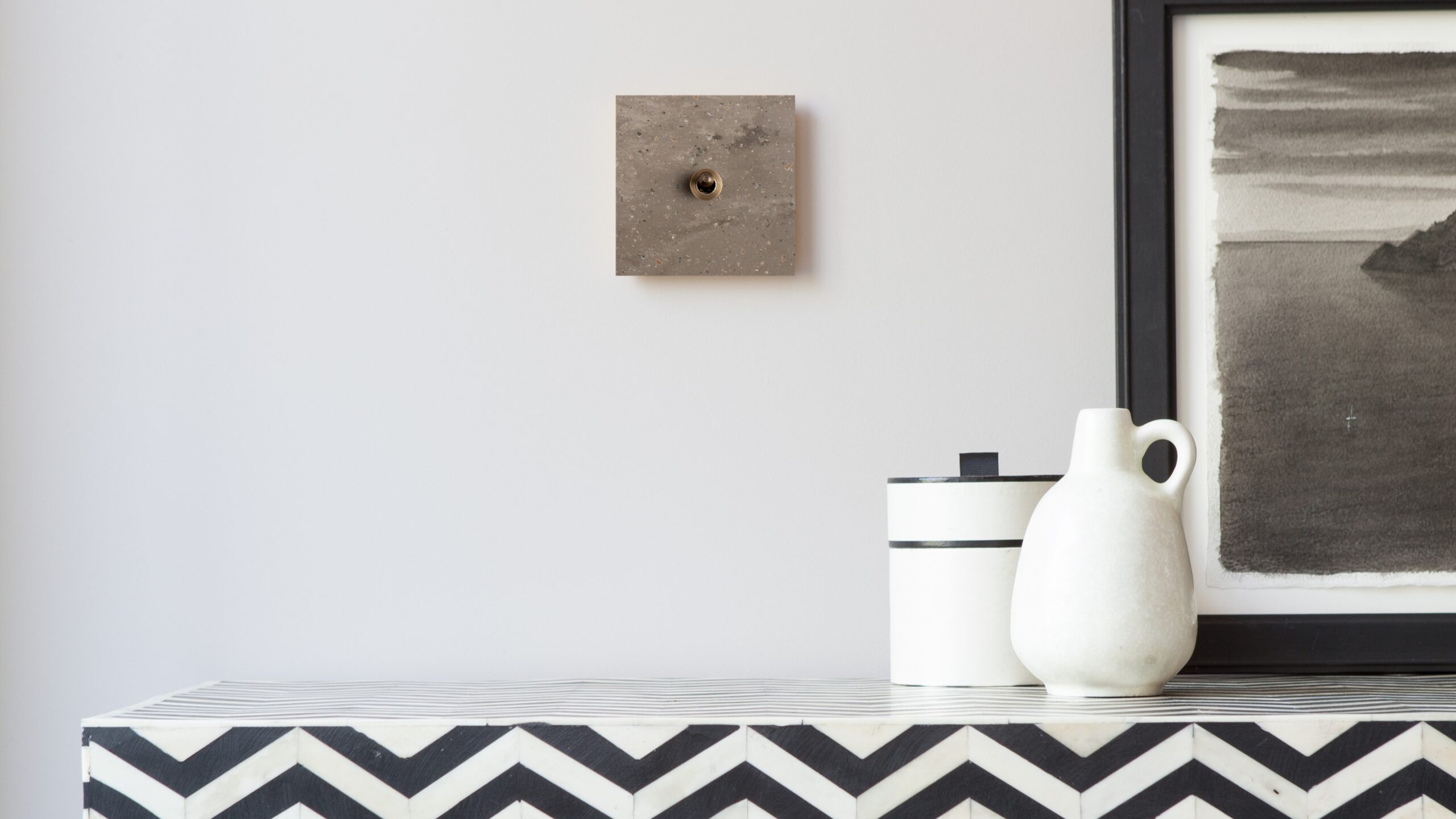 New Things heeft een uitgesproken ontwerp knopje; verfijnd, strak en stoer. Afdekplaten in marmerdessin met draaidimmers en schakelaars ton-sur-ton of juist met een contrasterend dessin.