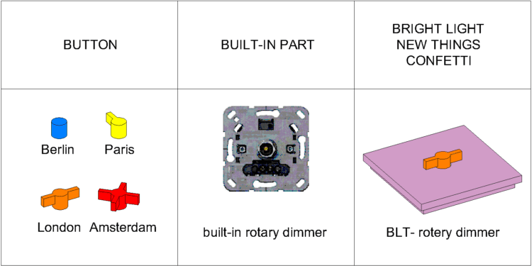 For our BLT collection of design light switches & wall sockets, we only use components from Merten by Schneider for the light switches and Niko for the wall sockets. Conversely, our finishing parts for rotary dimmers are compatible with multiple brands of flush-mounted components.